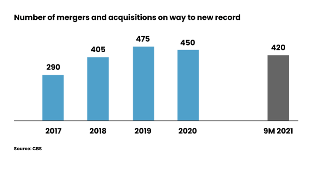 Auch die Konsolidierung in der IT-Branche geht weiter. Laut CBS war die Zahl der Fusionen und Übernahmen in den ersten neun Monaten des Jahres 2021 um fast ein Viertel höher als im gleichen Zeitraum des Jahres 2020.